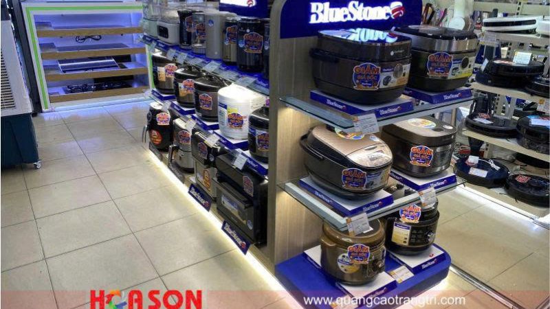 Phần đầu kệ đảo Hoa Sơn được thiết kế để gắn logo và tên thương hiệu. Kết hợp với đó là hệ đèn chiếu sáng gia tăng khả năng nhận diện. Đây là yếu tố quan trọng giúp các thương hiệu thiết bị nhà bếp tạo dấu ấn mạnh mẽ trong không gian bán lẻ.
