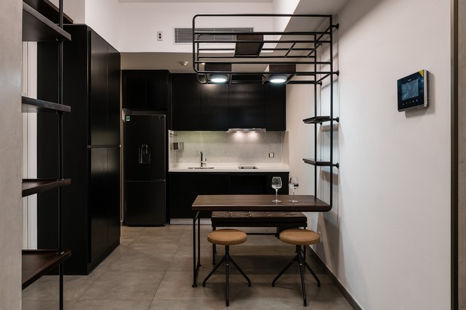Để tiết kiệm tối đa diện tích, hầu hết các chi tiết nội thất đều được tối giản hoá bằng những đường nét mảnh. Hệ thống khung sắt có khả năng chịu lực lớn. Vừa là giải pháp thiết kế vừa là điểm nhấn của căn hộ.