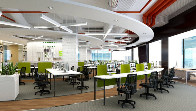 Ngoài ra thì văn phòng cũng được trang hoàng những thiết bị hiện đại, phục vụ công việc. Kết hợp cùng hệ thống đèn chiếu sáng độc đáo, mới lạ. Tạo nên bầu không khí vui vẻ, hòa đồng và một môi trường làm việc chuyên nghiệp.
